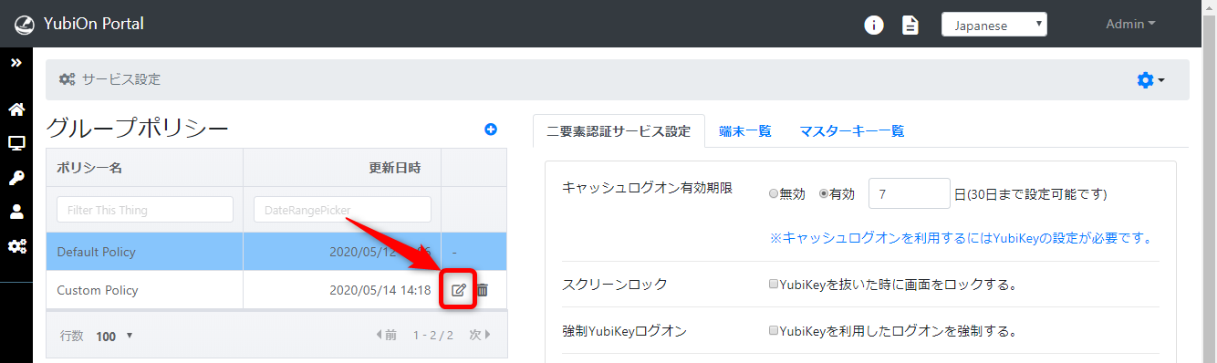 二要素認証サービス設定を複数設定する機能をグループポリシーと呼びます。 グループポリシー設定を反映させるには、グループを作成し、端末を割り当て、サービス項目を設定する必要があります。