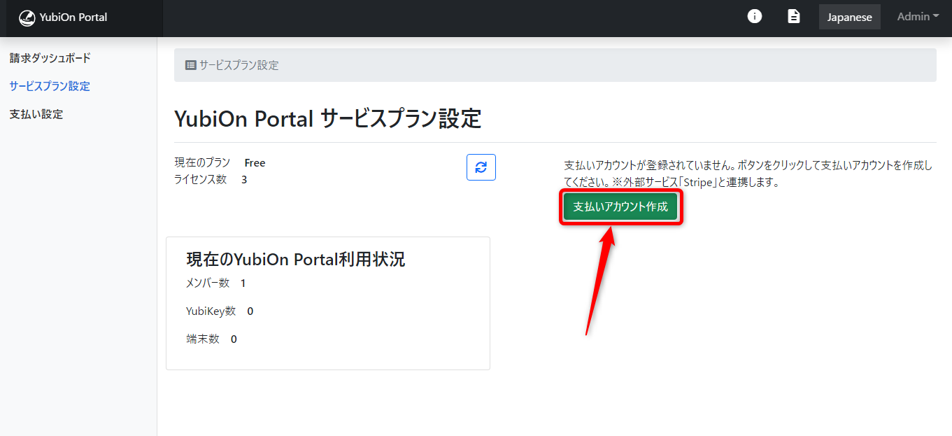 YubiOn Portalの請求ダッシュボードより支払いアカウントを作成します。(初回のみ)