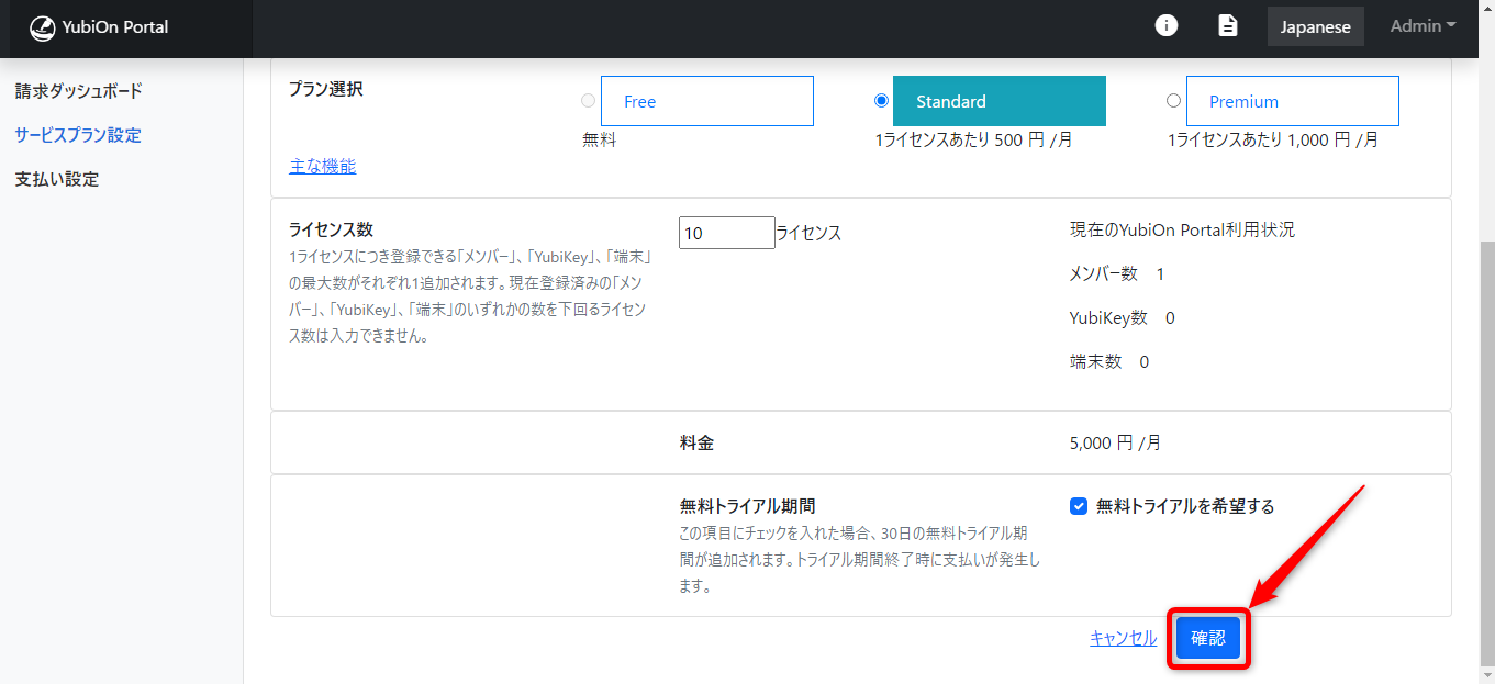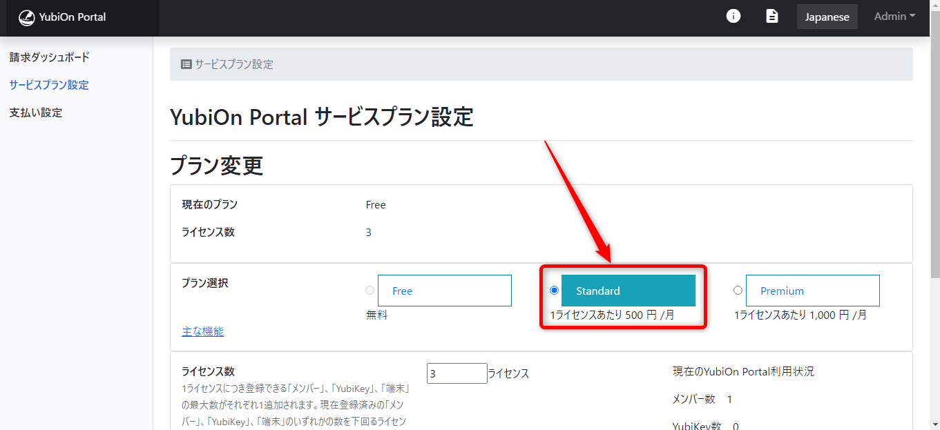 決済完了後、YubiOn Portalに再ログインすることでプラン内容が反映されます。