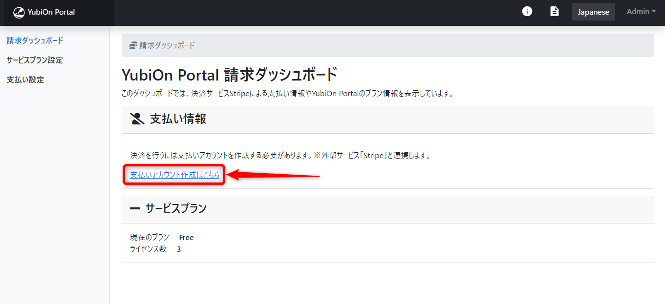 YubiOn Portalの請求ダッシュボードより支払いアカウントを作成します。(初回のみ)